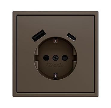 Enchufe Schuko con puertos USB C y USB A, integrable en la serie de mecanismos e interruptores Zennio de 70 x 70 mm de diseño elegante y atemporal, enrasados con el marco, para una perfecta combinación con las pantallas y los pulsadores capacitivos Z28, Flat 70 y Tecla 70.