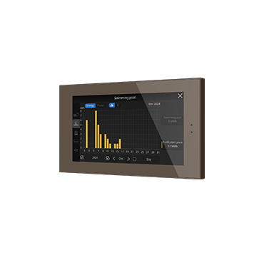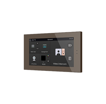 Écran tactile capacitif couleur de 5” rétro-éclairé avec une résolution de 480 x 854 pixels, pouvant être installé à l’horizontale comme à la verticale, qui permet le contrôle total de l’installation, grâce à ses 12 pages personnalisés, gardant une esthétique minimaliste. Il dispose de 2 entrées analogiques-numériques, une sonde de température interne et 2 thermostats indépendants. Il inclut un détecteur de proximité pour détecter l’activité proche pour un allumage rapide, ainsi que pour désactiver l’écran de veille, s’il a été configuré. Il dispose aussi d’un capteur de luminosité pour un réglage automatique de l’éclairage. Il inclut un port USB et Ethernet pour le téléchargement du firmware. Installation en boîtier d’encastrement standard européen et anglais.
